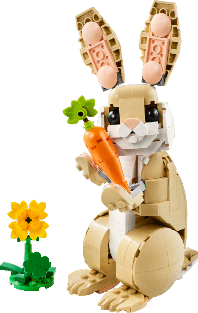 Dieses LEGO® Creator Häschen wirkt auf den ersten Blick wie ein niedlicher Hase, lässt sich jedoch auch in ein bewegliches Lama oder sogar in eine Robbe umbauen. Passendes Zubehör für jedes der drei LEGO®-Tierchen sorgt für zusätzlichen Spass. Ob als Osterhase für zuhause oder als süsses Geschenk – dieses Set begeistert kleine Baumeisterinnen und Baumeister gleich mehrfach.